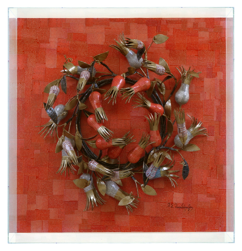 The light and colour has run wild and flowed back and forth throughout Panagiotis Papadopoulos’ artistic development and especially now, during the latest stage of this capable creator, as he ultimately convinces us that he has reached an unprecedented zenith. It is one in which his productive intellectual and psychological stimulus has been realised - αναφανδον and overtly - through every piece of raw material used [paper, newspaper extracts, processed ceramic matter, coloured glass, tesserae, semi-precious stones, etc.] and all with an inspired connection to it.